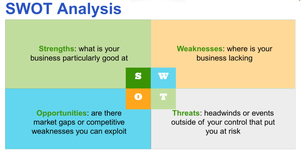 As you can see, a lot goes into evaluating the competition and assessing how you can best position your company.  A SWOT analysis can help you summarize what you’ve learned and focus on the most important aspects.