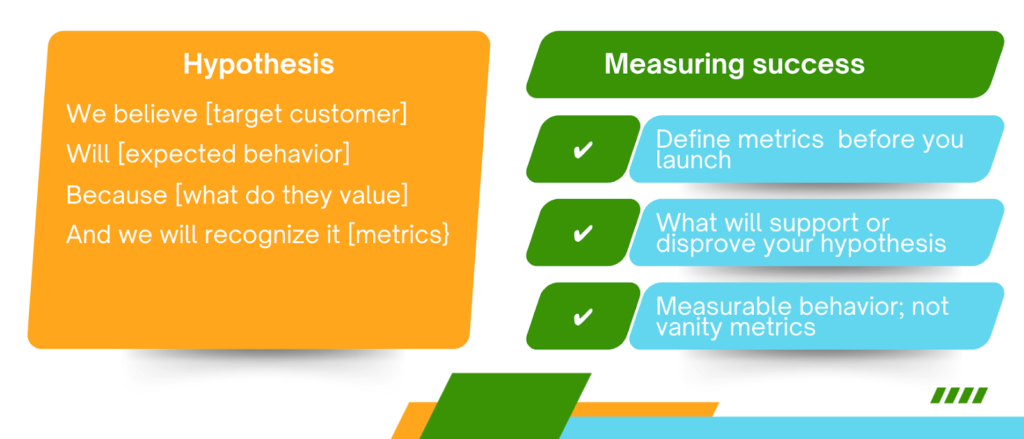 Since the goal of the MVP is to learn, it’s important to define what success looks like. What metrics will indicate that you’re on the right track, that you’ve made reasonable choices.