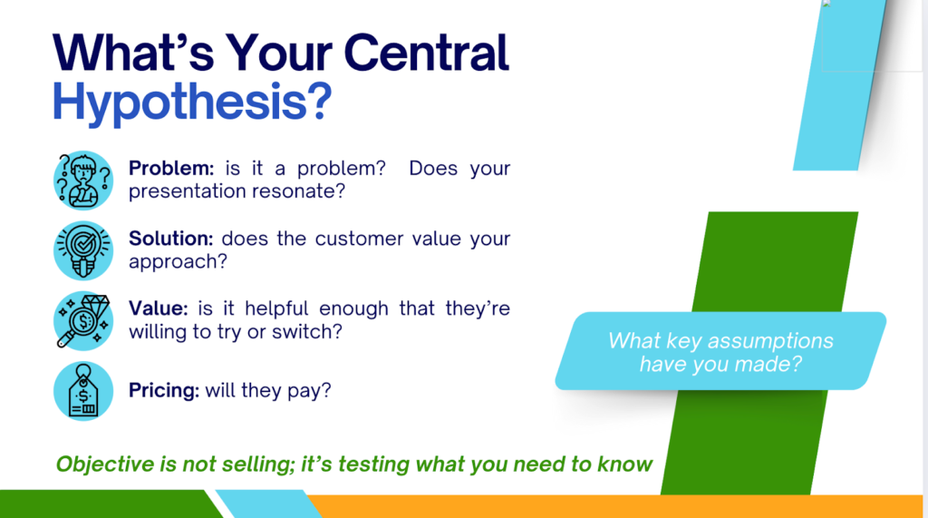 - The goal is to confirm that you’re solving a real problem in a way that resonates with customers, not that you can address every annoyance they’ve ever faced.