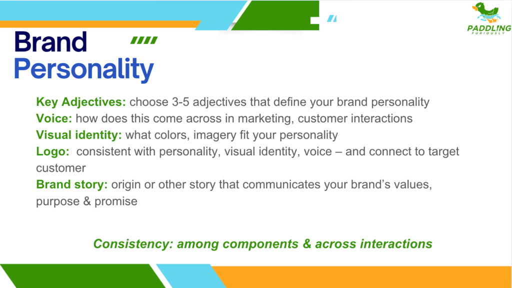 - Personality: the presentational aspects of branding – how things look and sound – are important reflections of your company’s values and positioning