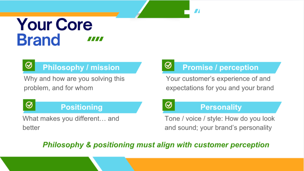 People tend to think of a brand as a logo, maybe a tag line, but it starts much deeper, from your core mission and values, and radiates out from there. Good brands are built on four pillars:
